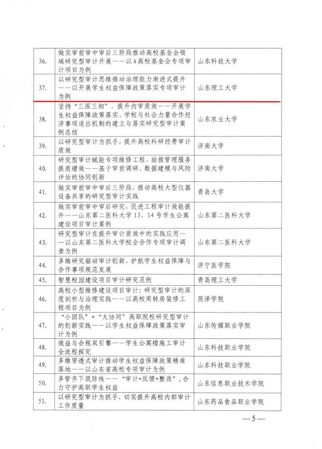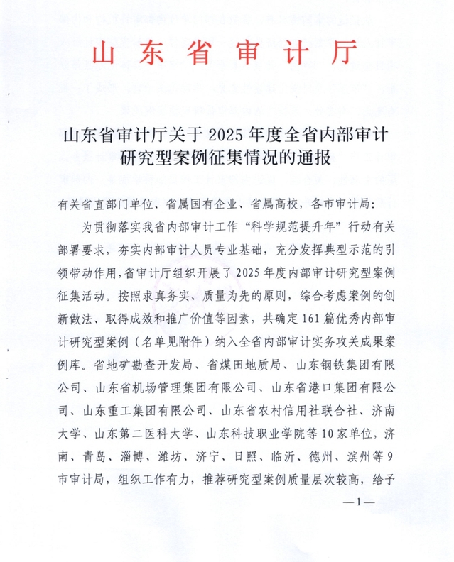 近日,山东省审计厅下发《关于2025年度全省内部审计研究型案例征集情况的通报》,我校审计处报送的《以研究型审计思维推动治理能力渐进式提升——以开展学生权益保障政策落实专项审计为例》审计案例,获评2025年度全省优秀内部审计研究型案例,纳入全省内部审计实务攻关成果案例库。